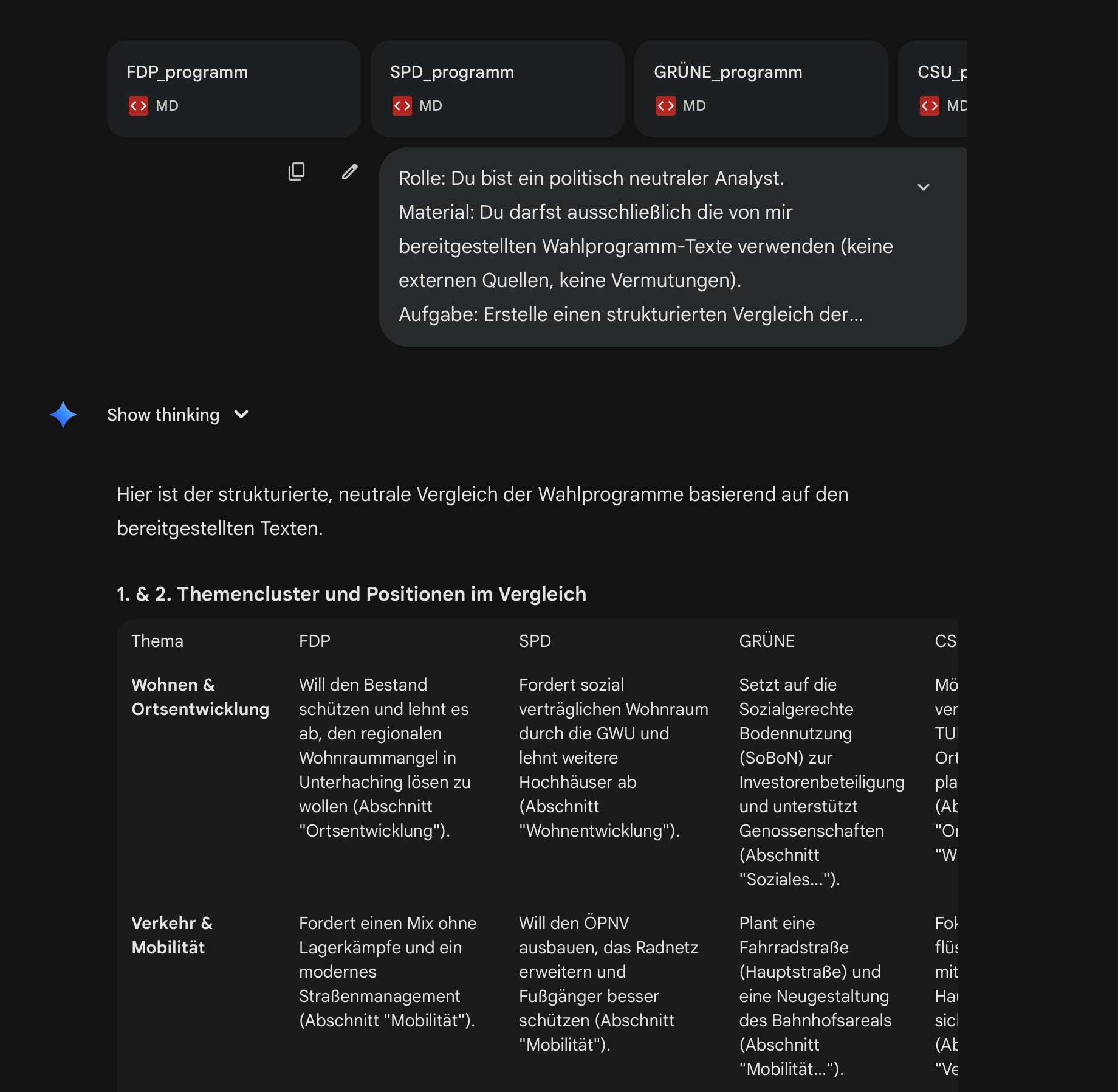 Die Auswertung des Prompts mit den Parteiprogrammen unter Gemini Pro 3.1 finden Sie nachfolgend, falls Sie an den Ergebnissen interessiert sind.
